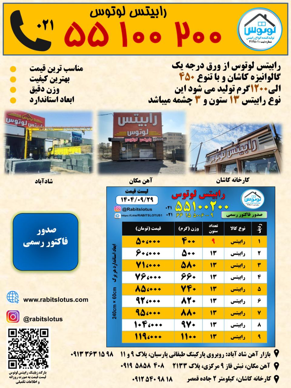 شرکت ما در زمینه تولید انواع رابیتس از ورق درجه یک گالوانیزه کاشان و با تنوع ۵۰۰ الی ۱۱۰۰ گرم فعالیت دارد.