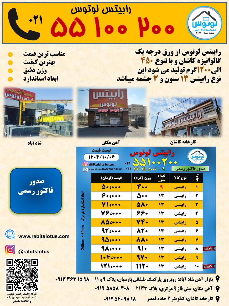 شرکت ما در زمینه تولید انواع رابیتس از ورق درجه یک گالوانیزه کاشان و با تنوع ۵۰۰ الی ۱۱۰۰ گرم فعالیت دارد.