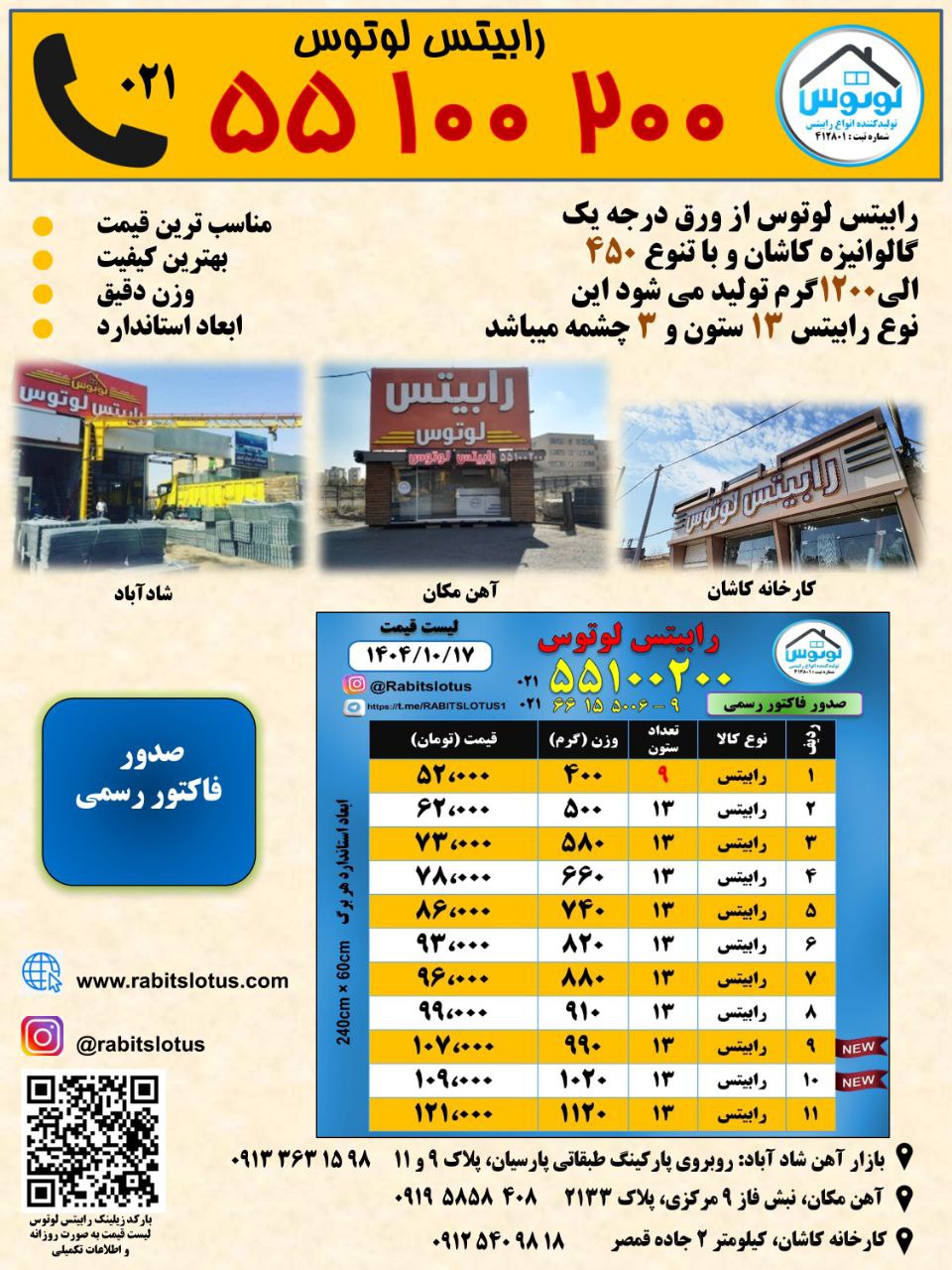 شرکت ما در زمینه تولید انواع رابیتس از ورق درجه یک گالوانیزه کاشان و با تنوع ۵۰۰ الی ۱۱۰۰ گرم فعالیت دارد.