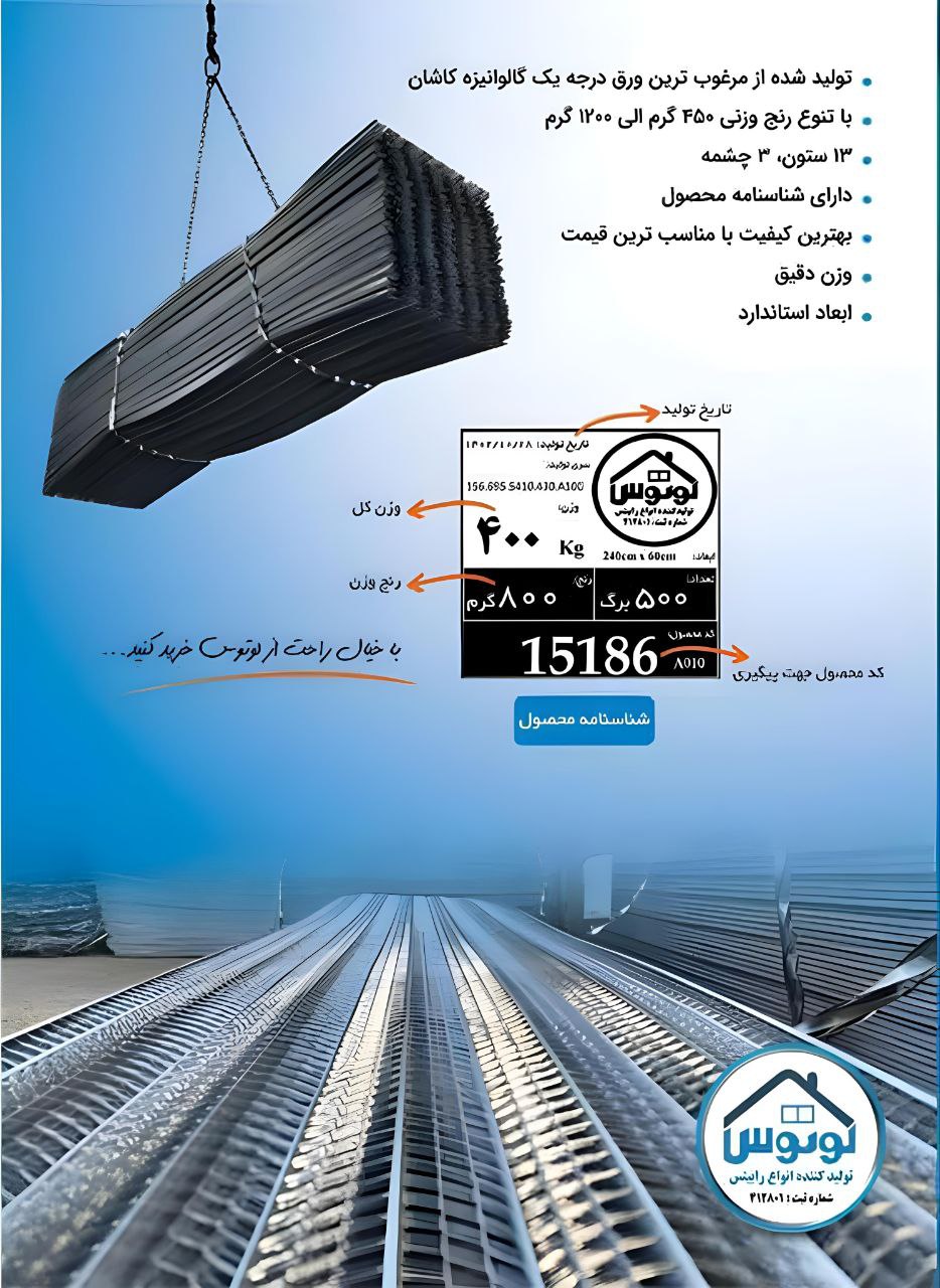 شرکت ما در زمینه تولید انواع رابیتس از ورق درجه یک گالوانیزه کاشان و با تنوع ۵۰۰ الی ۱۱۰۰ گرم فعالیت دارد.