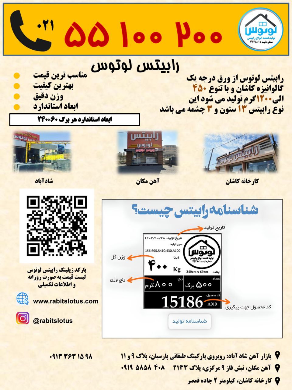 شرکت ما در زمینه تولید انواع رابیتس از ورق درجه یک گالوانیزه کاشان و با تنوع ۵۰۰ الی ۱۱۰۰ گرم فعالیت دارد.