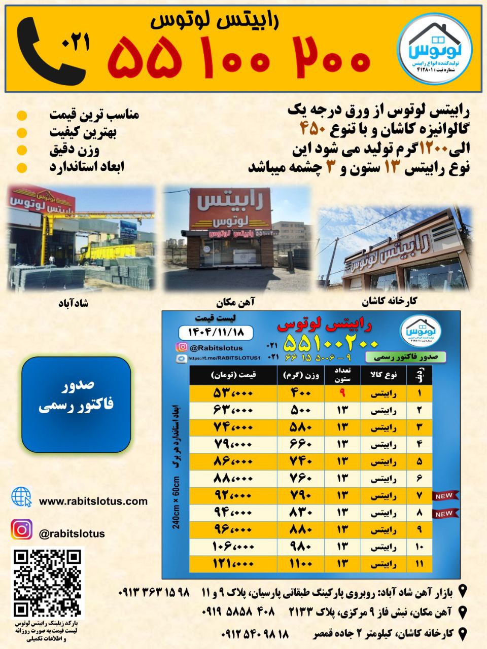 شرکت ما در زمینه تولید انواع رابیتس از ورق درجه یک گالوانیزه کاشان و با تنوع ۵۰۰ الی ۱۱۰۰ گرم فعالیت دارد.