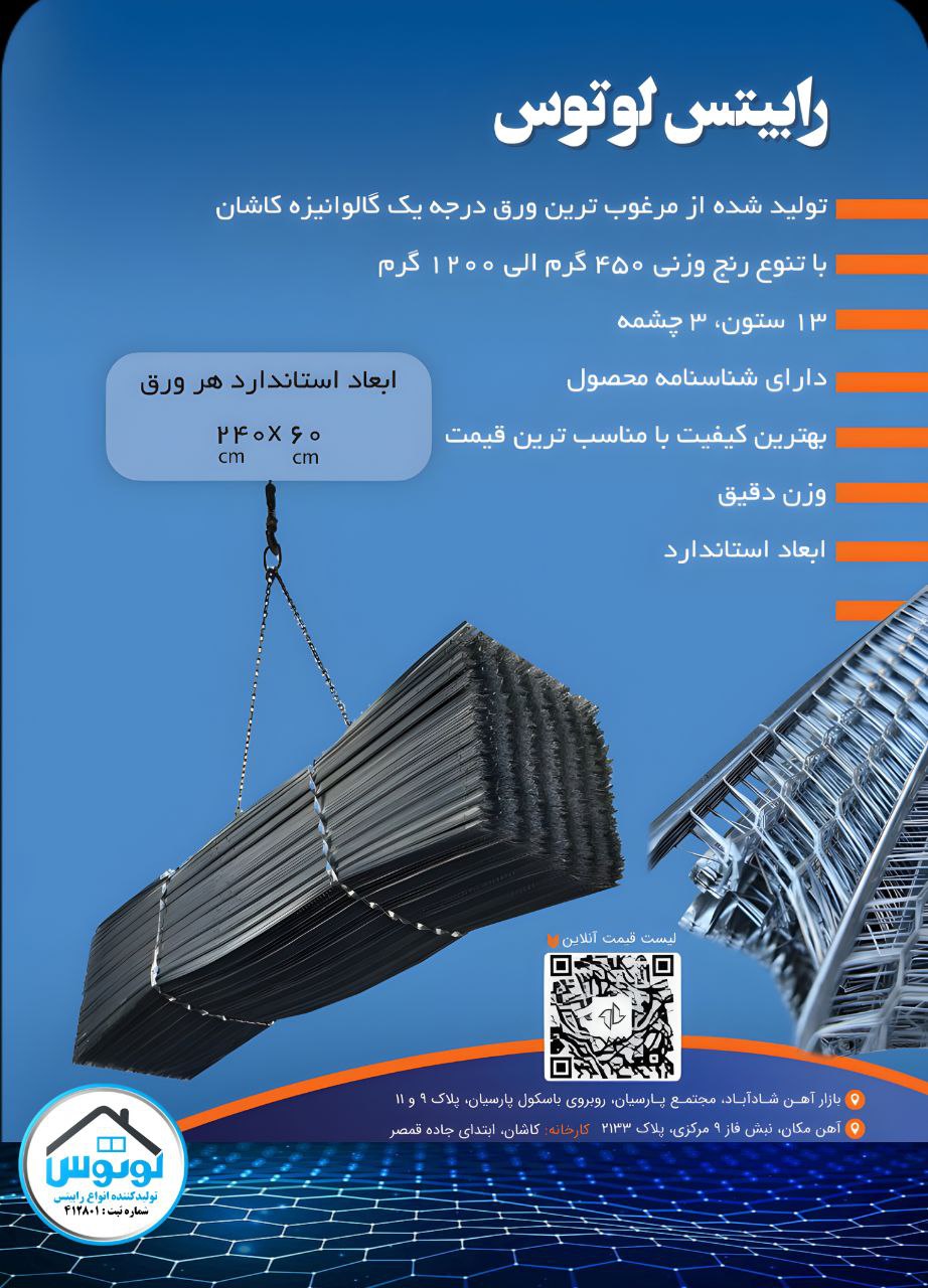 شرکت ما در زمینه تولید انواع رابیتس از ورق درجه یک گالوانیزه کاشان و با تنوع ۴۰۰ الی ۱۲۰۰ گرم فعالیت دارد.